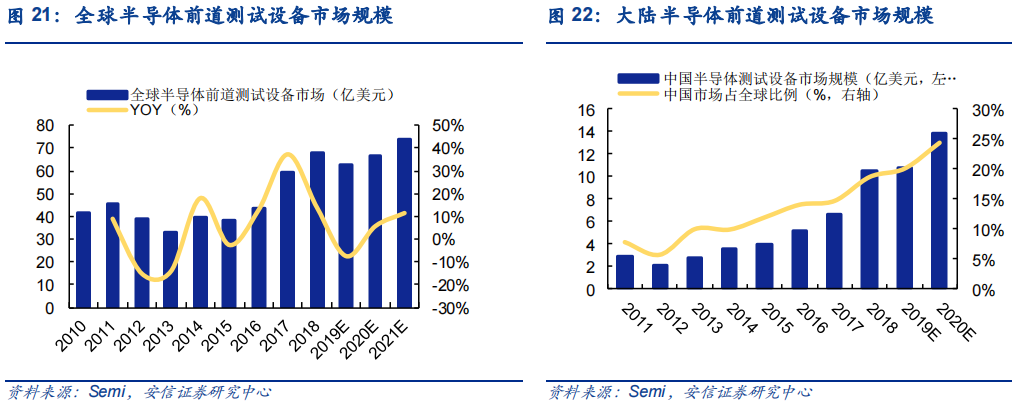 根据 Semi 及 Gartner 统计,半 导体前道测试设备一般在半导体设备支出中占比 11~13%,后道测试设 备占比 8~9%,合计占比约 20%,根据此值估算,2020 年全球半导体设 备总市场规模约 712 亿美元,按 12%与 8.5%测算,前道测试设备市场 约 86 亿美元,后道测试设备市场约 61 亿美元,合计 147 亿美元,目前 前道设备国产化率不足 1%,后道设备国产化率不足 10%,国产替代空 间接近百亿美元,且随着半导体设备市场进入扩张周期,前后道设备 需求均将显著受益。