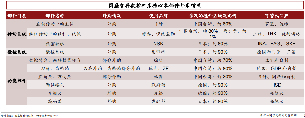 ➢ 我国机床产业链整体发展滞后,缺乏核心零部件自制能力。我国机床行业虽有千亿规模,但总体竞争力仍显不足,呈现 大而不强的局面,其中一重要原因就是缺乏核心零部件的自制能力。以国内民营机床龙头国盛智科为例,无论是传动系 统、数控系统还是各类功能部件中,核心零部件的外采比例普遍都超过80%。实现核心零部件的国产替代,是我国机床 行业未来发展中亟待解决的瓶颈问题。