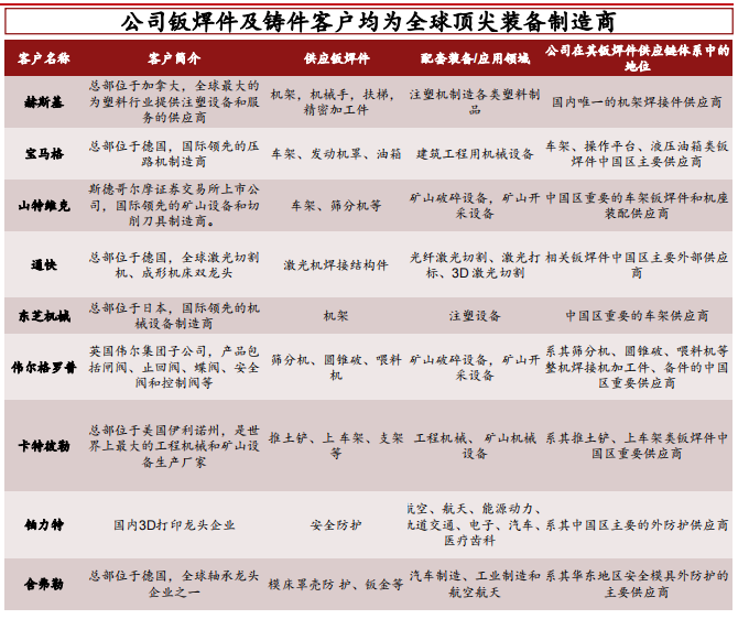 ➢ 公司在高端零部件生产领域拥有技术优势和精细化成 本管理经验。这些技术和经验主要源于公司长期作为 国际知名制造企业钣焊件和铸件的供应商,公司通过 与大客户合作提升了产品质量并改善了生产流程,进 而降低了公司高端零部件的生产成本。