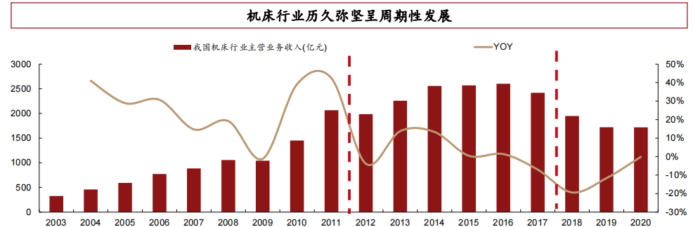 (4)第四阶段:2012年以来,受下游行业需求萎缩影响,我国机床行业进入下行周期。由于产品同质化日趋严重,缺乏核心技术,并购失败等多重原因,国营企业逐步退出历史舞台,行业格局出清。与之相反,民营企业在此期间不断发展,已取得国产机床行业主导。