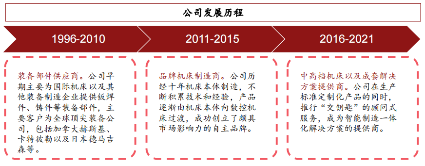 ➢ 从全球顶级装备制造零部件供应商到国产机床领军企业。公司早期主要为国际机床以及其他装备制造企业提供钣焊件、铸 件等装备部件,主要客户为全球顶尖装备公司,包括加拿大赫斯基、卡特彼勒以及日本德马吉森等。为国际顶尖装备公司供 应零部件的历史磨练了公司自身的技术工艺,积攒了精细化管理经验,助力公司逐步成为国产数控加工中心的领军企业。