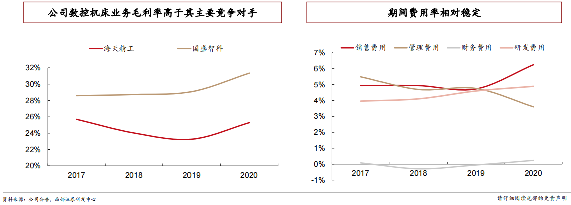 ➢ 公司盈利能力显著优于主要竞争对手。公司数控机床毛利率高于其主要竞争对手海天精工5个百分点左右,主要原因有两个 方面:第一,公司高档数控机床占比较高,单价逐年提升;第二,公司高端零部件(钣焊件及铸件)自制率高,成本曲线 低。