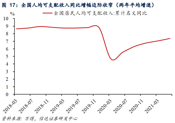 ➢ 收入:人均收入持续爬坡,财产收入表现优于工资和经营性收入。总量 上看,人均可支配收入在爬坡,但空间上尚未回归至疫情前。分类来看, 城乡居民收入修复路径分化,农村暂时快于城镇,主要原因是城镇生产经 营活动受到的影响更大。分项上看,财产与经营收入的分化较明显,缘于 大宗商品涨价挤兑了工资收入,同时全球流动性过剩推升了财产收入。