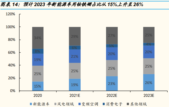 钕铁硼是目前最好的永磁材料,预计 2023 年全球新能源汽车对钕铁硼 的需求量为 36841 吨,占比从 2020 年的 15%上升到 2023 年的 26%; 风电领域永磁直驱电机渗透率逐年提升,预计 2023 年全球风电领域对 钕铁硼的需求量为 35125 吨;近几年变频空调生产中大量使用高性能钕 铁硼永磁材料替代铁氧体永磁材料,预计 2023 年全球变频空调对钕铁 硼的需求量为 28230 吨;预计 2023 年消费电子领域对钕铁硼的需求量 为 5618 吨。