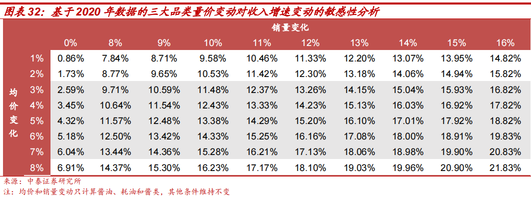 定量测算:(1)成本端:原材料与包材大涨下,成本端涨幅或可达 8%;(2)毛利率: 若单吨原材料成本上涨 7%时,三大品类均价上涨 5%,毛利率可维持基本不变;(3) 收入端:当三大品类均价上涨 5%时,其销量需上涨 12%,则收入增速可达 15%,若 其他条件不变,对应利润增速可达 22.88%。
