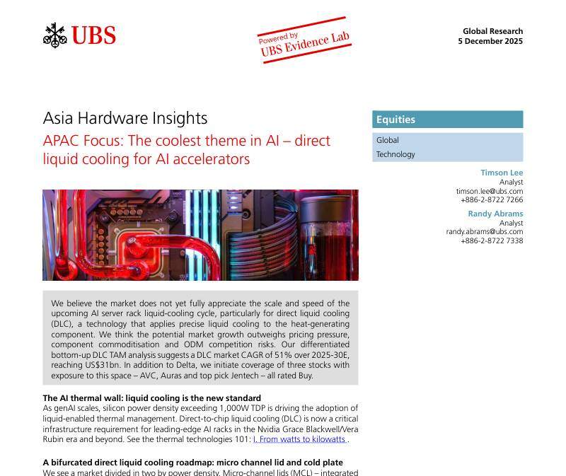 瑞银-亚洲硬件洞察:亚太聚焦:人工智能最酷主题——人工智能加速器的直接液冷-Asia Hardware Insights APAC Focus:The coolest theme in AI–direct liquid cooling for AI accelerators-20251205【50页】