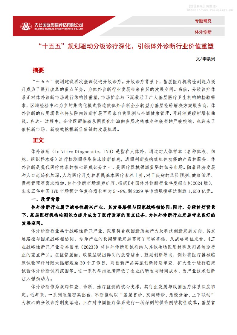 医药生物-大公国际资信评估:体外诊断专题研究:“十五五”规划驱动分级诊疗深化,引领体外诊断行业价值重塑-独立机构[李紫嫣]-20251215【7页】