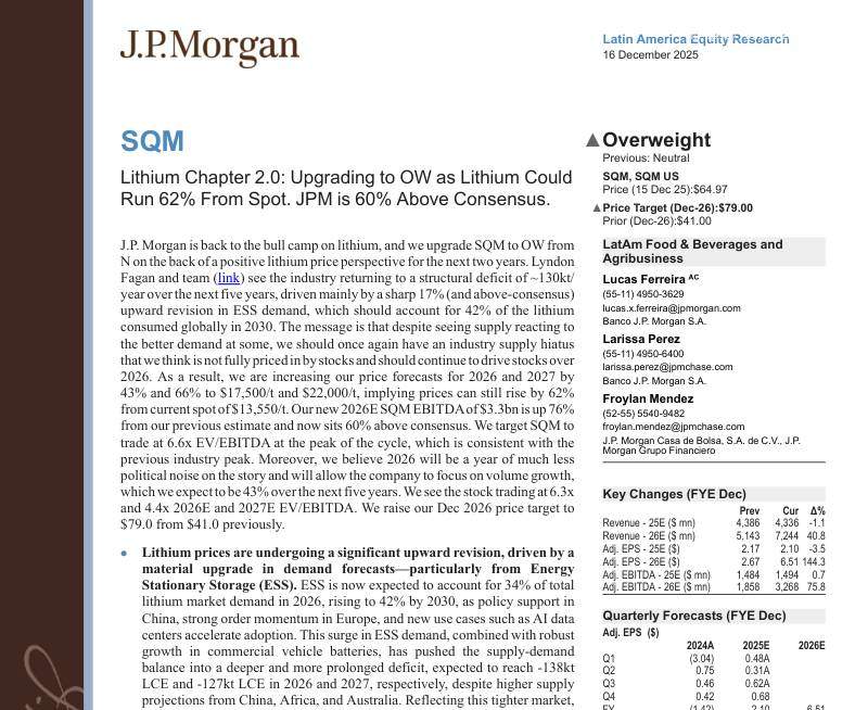 摩根大通-SQM(NYSE:SQM)锂业新篇章2.0:上调至增持,锂价或飙升62%,摩根大通目标价较市场共识高60%-SQM:Lithium Chapter 2.0:Upgrading to OW as Lithium Could Run 62% From Spot. JPM is 60% Above Consensus.-20251216【18页】